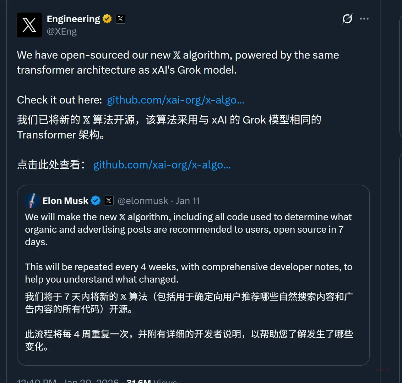 马斯克将 X 平台核心推荐算法开源,在意料之外,也似乎合乎情理。他觉得AI+内容才是算法的核心,推荐算法不应该受到人设定的条条框框限制。